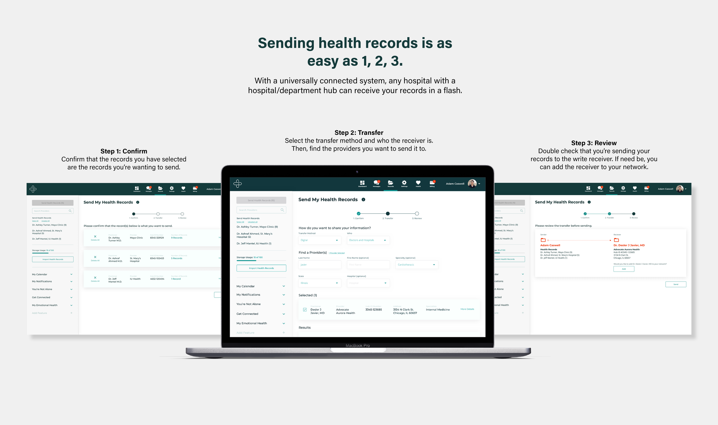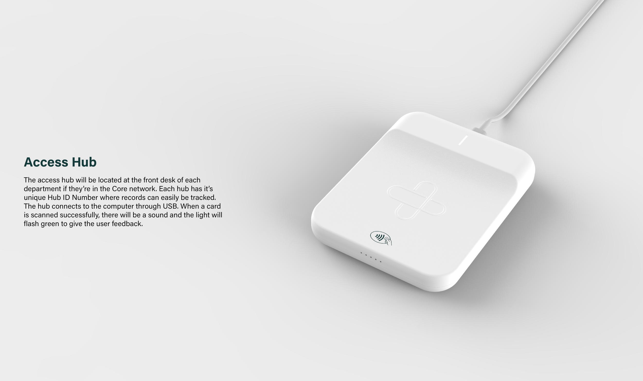 The system is comprised of 3 main components: the access hub (1) where the insurance card (2) can be scanned to release a patient’s record to the universal portal (3).