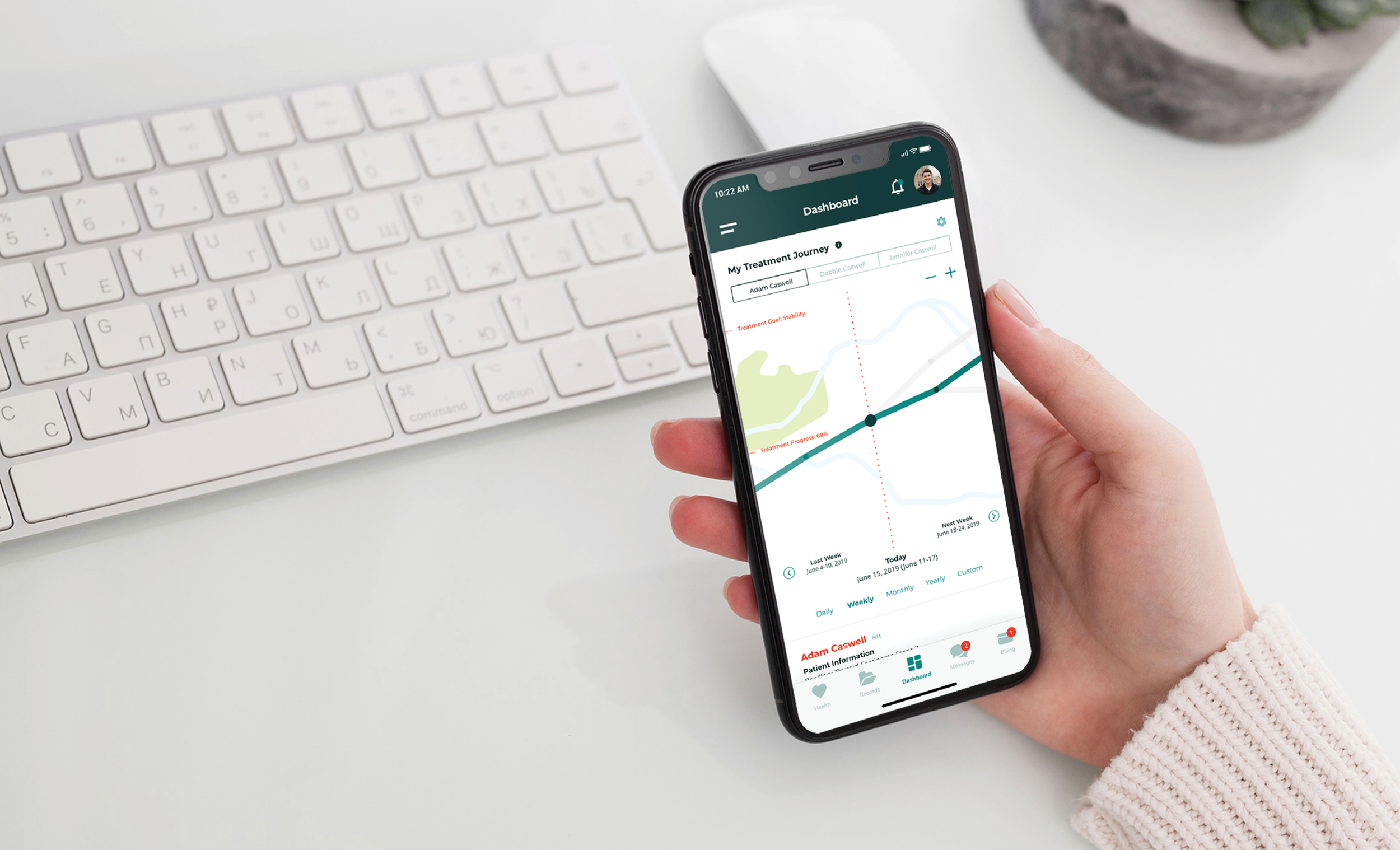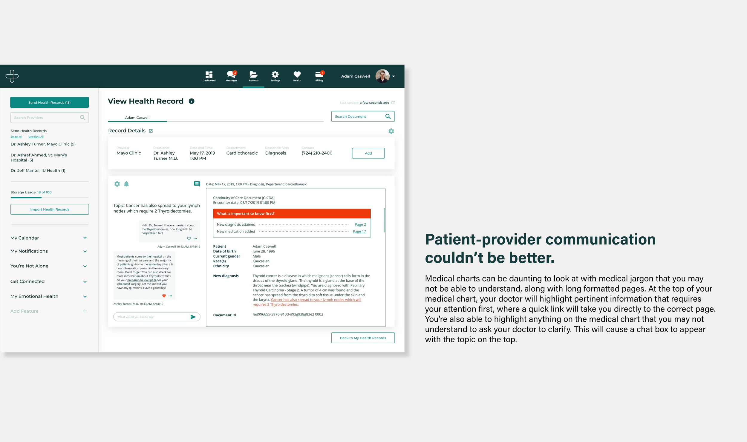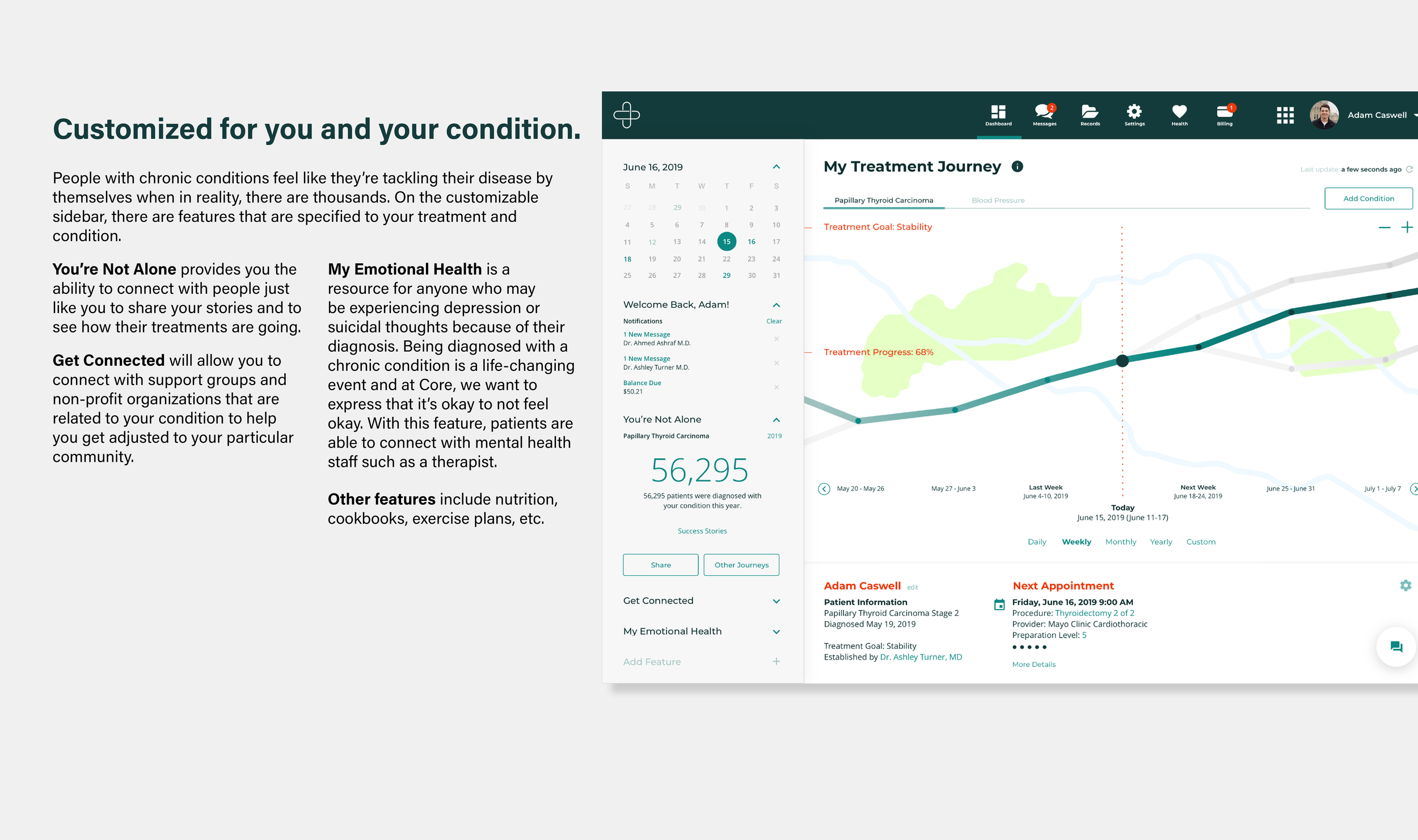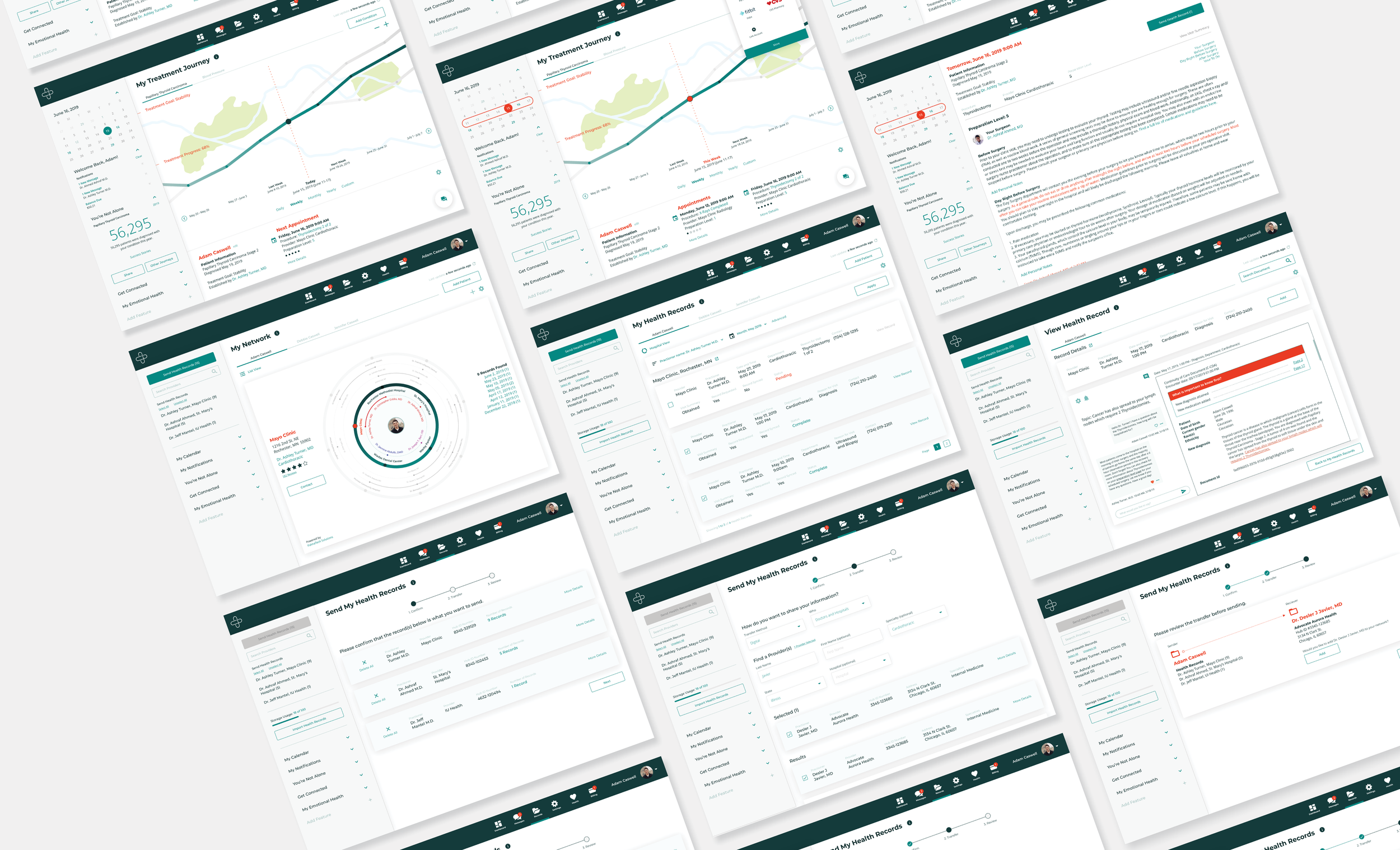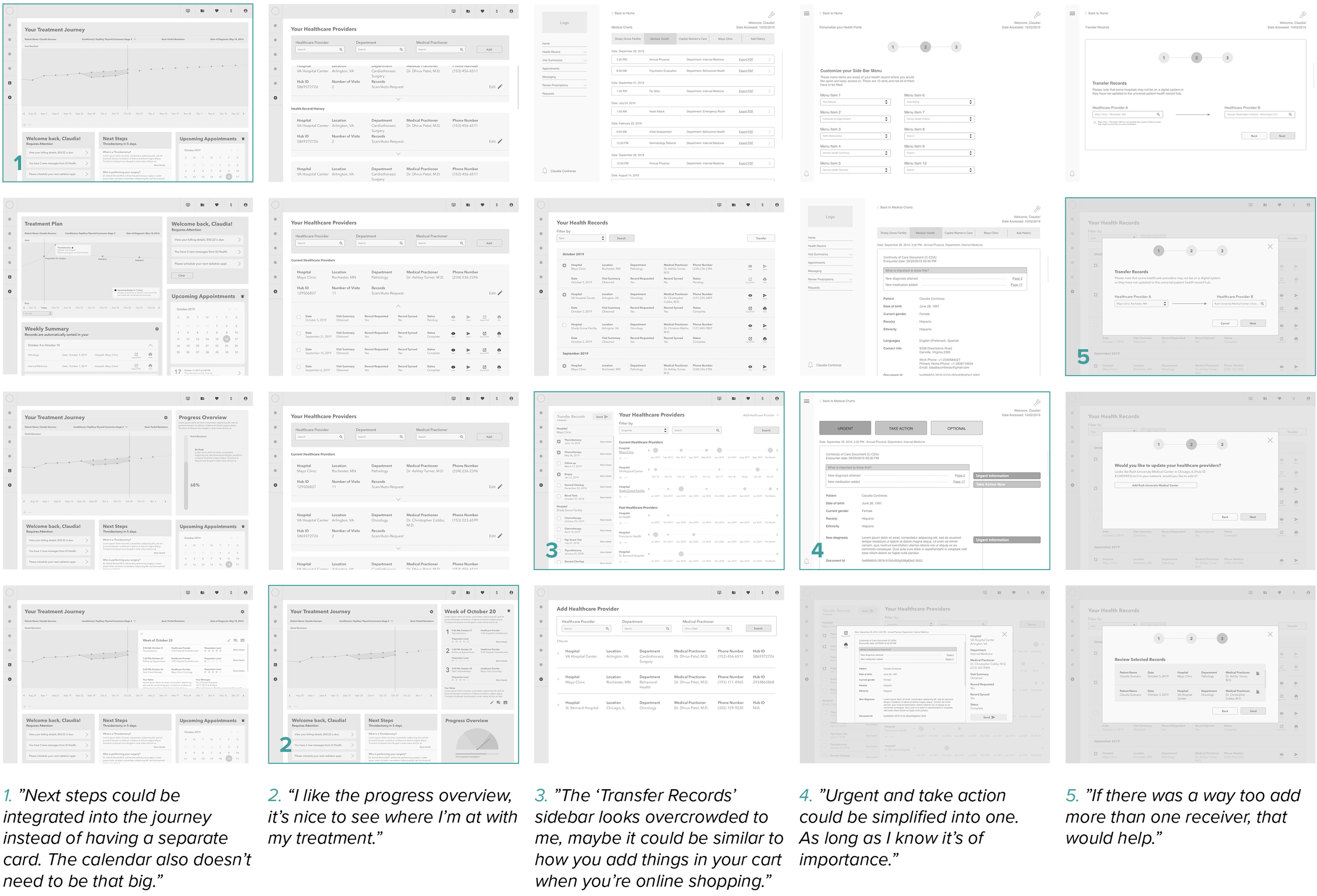 I created wireframes alongside Claudia, using an agile development methodology. I focused on 3 key components: the treatment journey, health records, and the healthcare network.