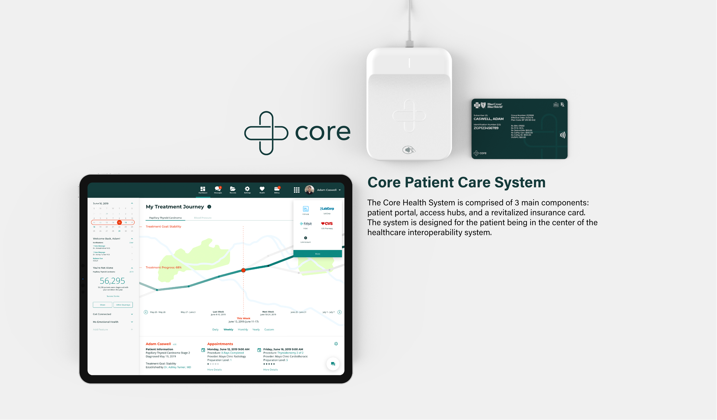 Core targets a critical problem in our healthcare system, young people with chronic conditions trying to navigate their care with a broken patient health record system. It is an all-in-one digital PHR ecosystem that consists of a universal patient platform, smart insurance key card and access hubs to revolutionize how health records are used and managed.