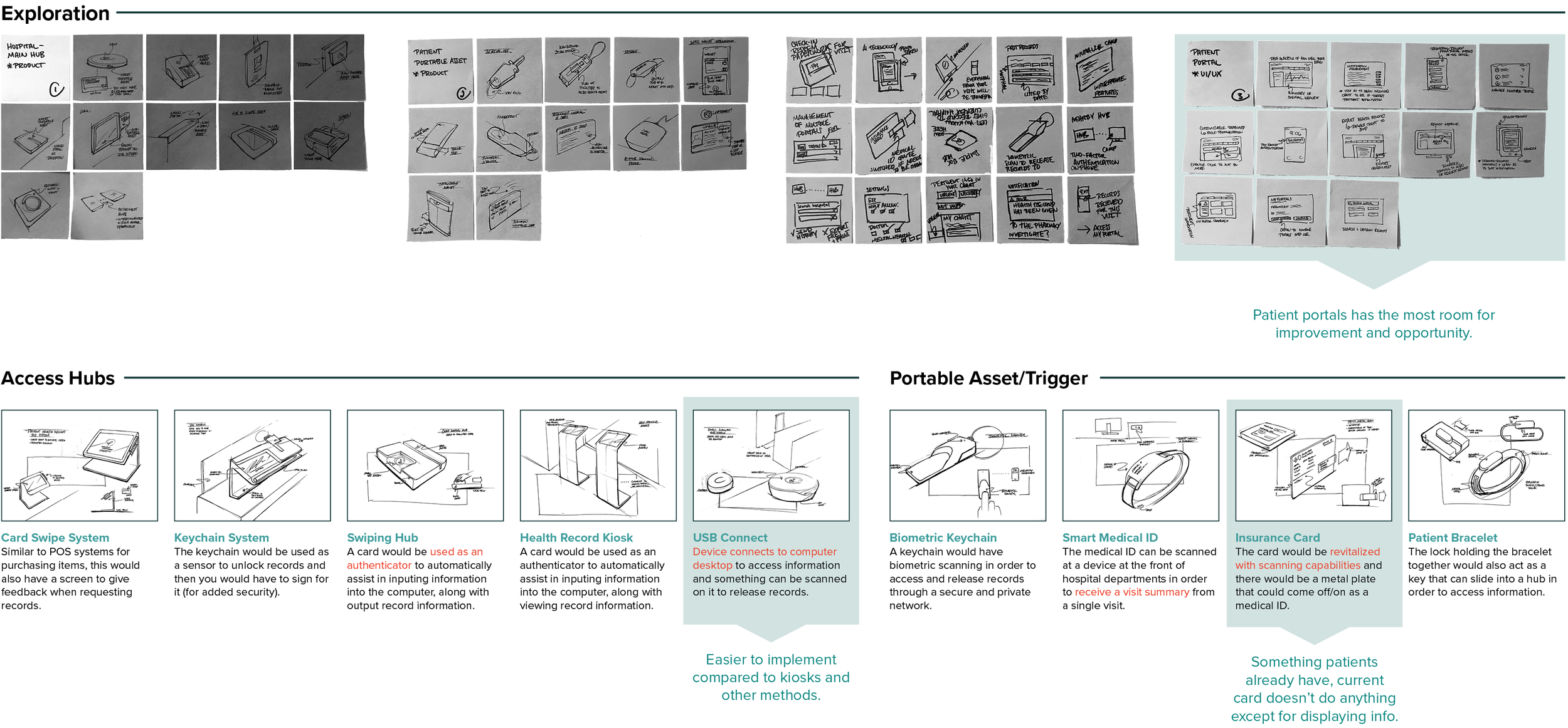 I looked into several portable assets such as key chains, biometric scanning, insurance cards w/scanning abilities. I also considered features for a better health portal such as a personalized dashboard, multiple portal management, and AI technology to scan and sort paper records.
