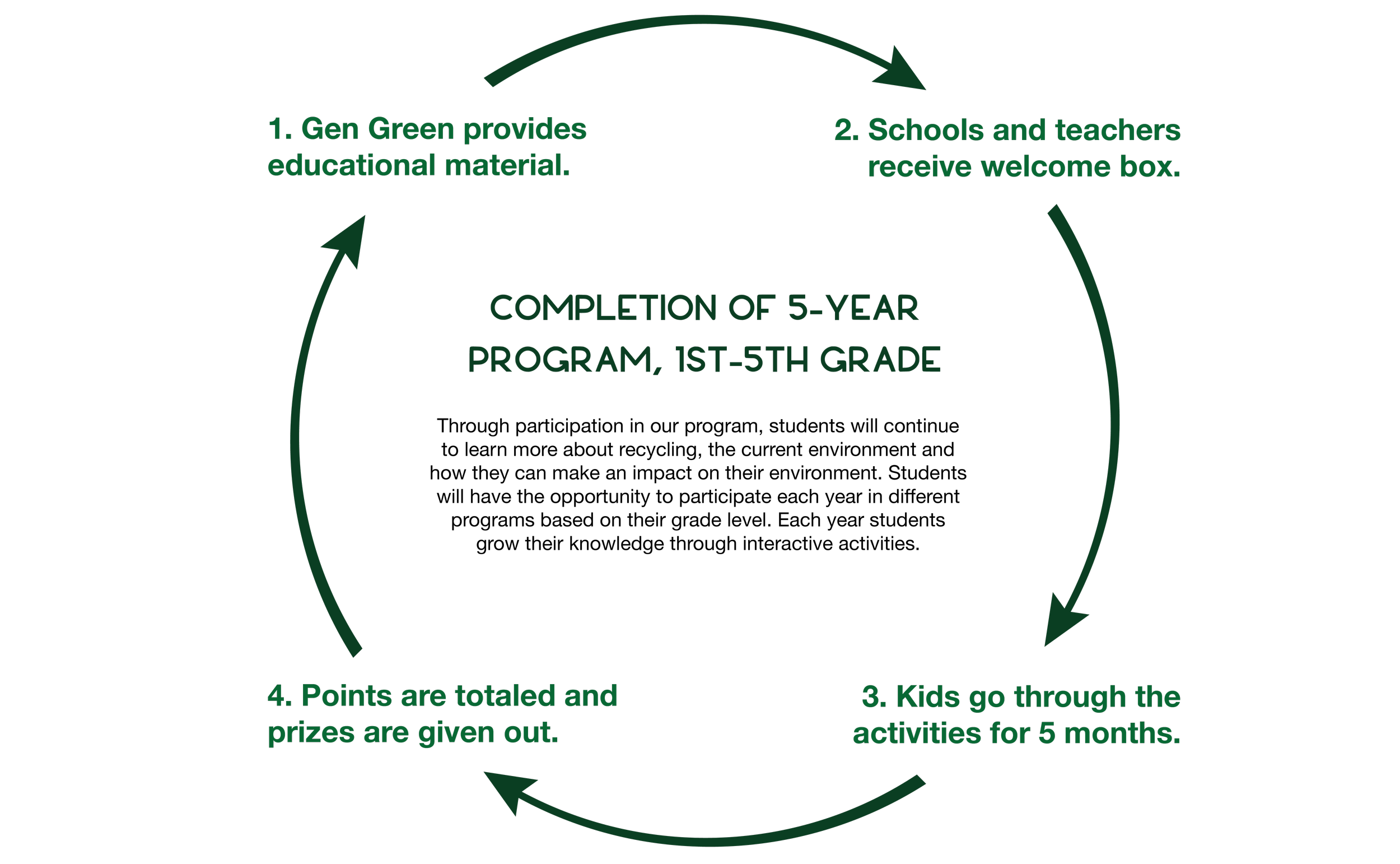 Generation Green is a 5-year educational program for 1st through 5th grade students. Each year includes 5 months of activities where schools are able to choose their timeline. We want to empower the next generation of kids to make an impact on their environment and provide them the tools to do so. Through participation in this program, students should walk away with knowledge about what is recyclable, how to recycle and sustained recycling habits.