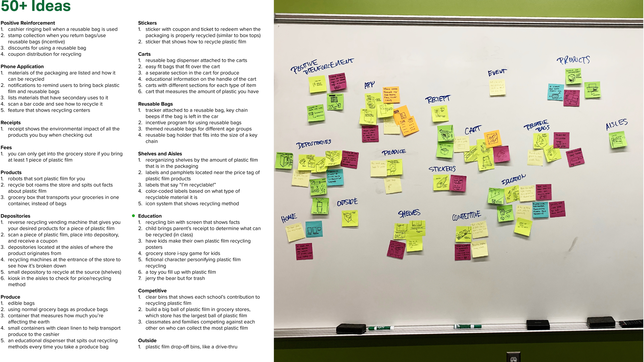This project was in collaboration with Design for America, Flexible Film Recycling Group of the American Chemistry Council, and Procter and Gamble. I was the team lead and my team members were Megan Pinkley (Marketing and Management), Maximo Jones (Civil Engineering), Nick Casetti (Chemical Engineering) and Vanessa Bahk (Industrial Design).